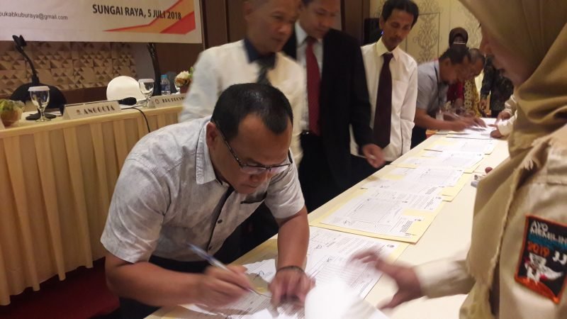 Ketua KPU Kubu Raya beserta anggota dan saksi saat menandatangani berita acara rekapitulasi pengitungan suara, Kamis (5/7). Foto: Robby