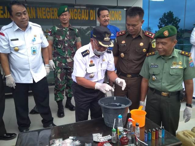 Barang bukti tersebut yaitu 138,13 gram sabu yang dimusnahkan dengan cara dilarutkan kedalam air. Selain itu, ikut dimusnahkan juga 54 butir obat terlarang jenis ekstasi dan erimin five, serta satu kotak produk olahan ayam dengan cara dibakar. Kemudian dimusnahkan juga 310 liter arak putih dengan cara dilarung ke dalam tanah yang sudah diberi lobang.