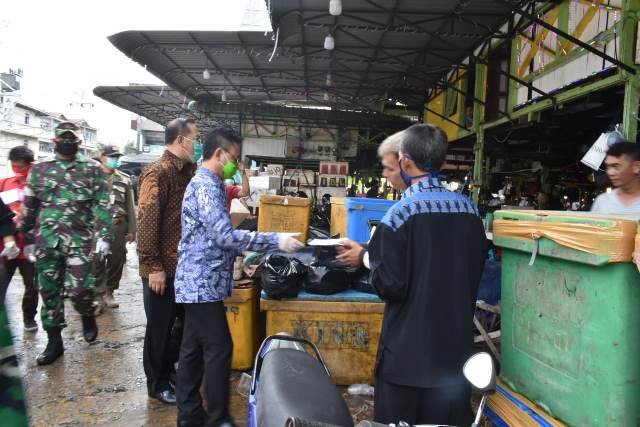 Wali Kota Pontianak Edi Rusdi Kamtono membagikan masker kepada para pedagang di pasar tradisional untuk mencegah bertambahnya kasus covid-19 di Pontianak. Foto: Ist